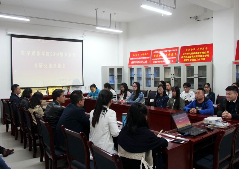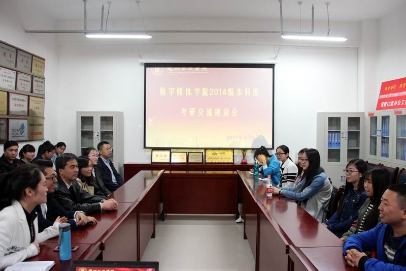 努力拼搏,放飞考研梦想;激情飞扬,彰显青春魅力。为进一步加强同学们对研究生入学考试的认识,了解前沿的就业形势,增强同学们的考研斗志,2017年4月6日中午,在优德88APP官网会议室召开优德88APP官网2014级本科考研交流座谈会。会议由主管教学的邢玉娟副经理主持,教务处副处长胡建军教授、校团委书记孙亮副教授、在读博士李志浩,史宝明副教授、张云副教授、李岚副教授、尹喆老师以及数媒学院2014级本科班有意向考研的三十多位同学参与本次座谈会。